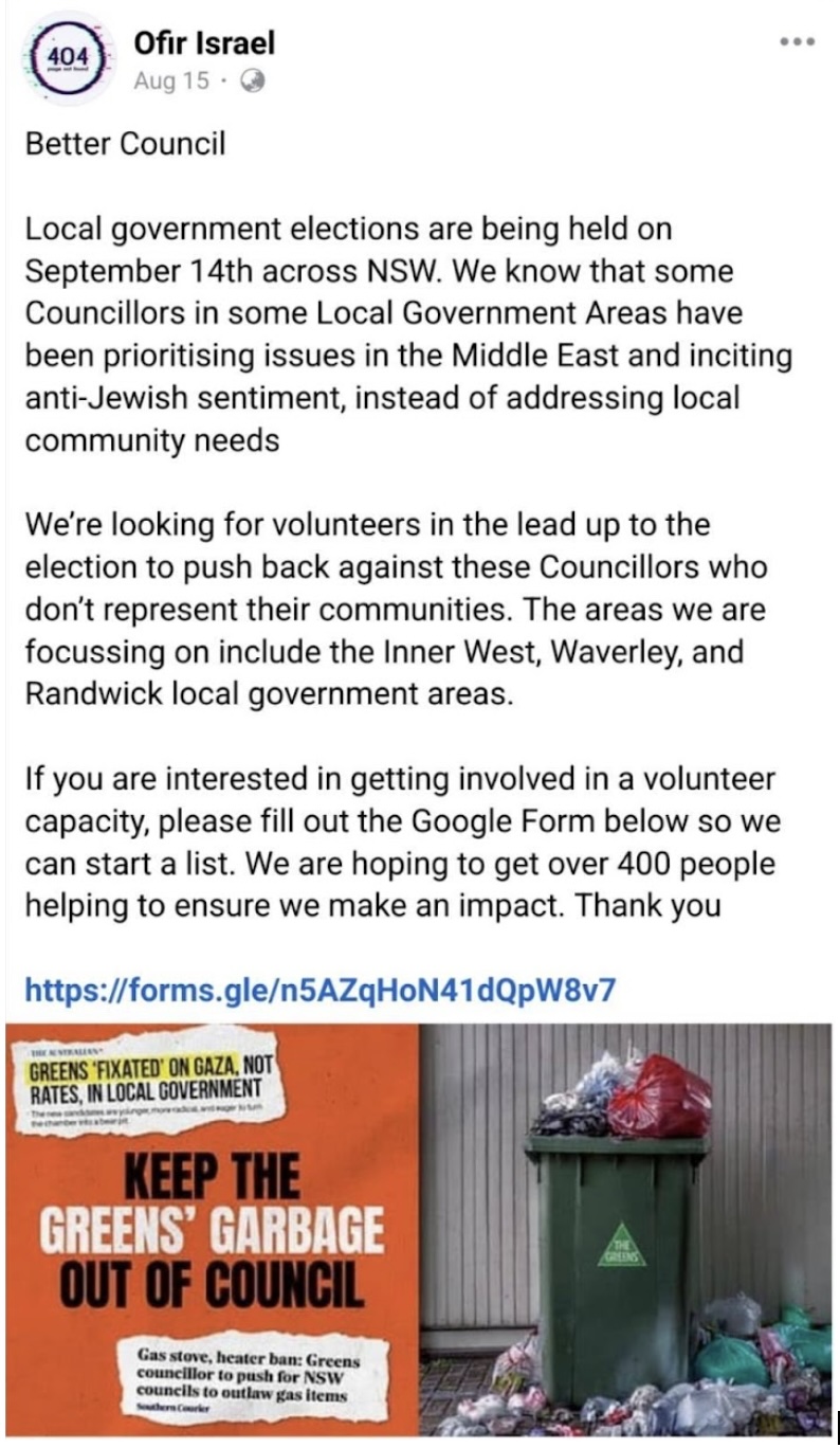 Better Council urged voters to ‘PUT GREENS LAST’, claiming the Greens had betrayed their environmental roots for an antisemitic obsession with Israel, leaving behind their environmental roots.