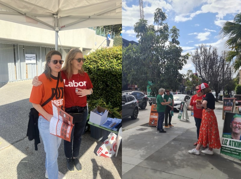Pictured: Left: A labor and Better Council volunteer in Waverley embrace and Right: a Labor volunteer in the Inner West holds Better Council flyers with Deputy Mayor Chloe Smith.