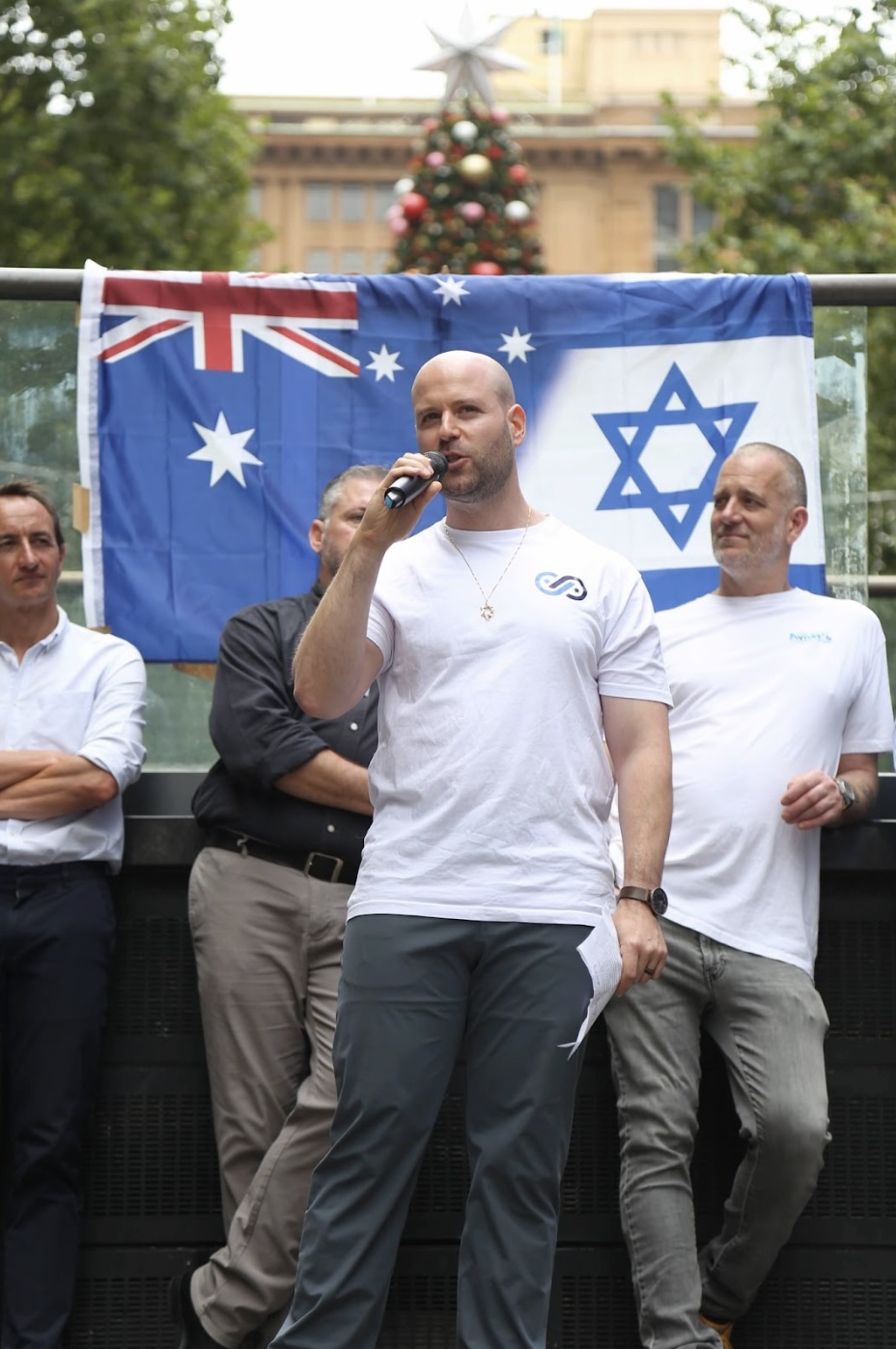 Pictured: Ofir Birenbaum speaking at the December Together with Israel rally, background Senator David Sharma and Ed Halmagyi. Source: ‘Together With Israel’ Facebook