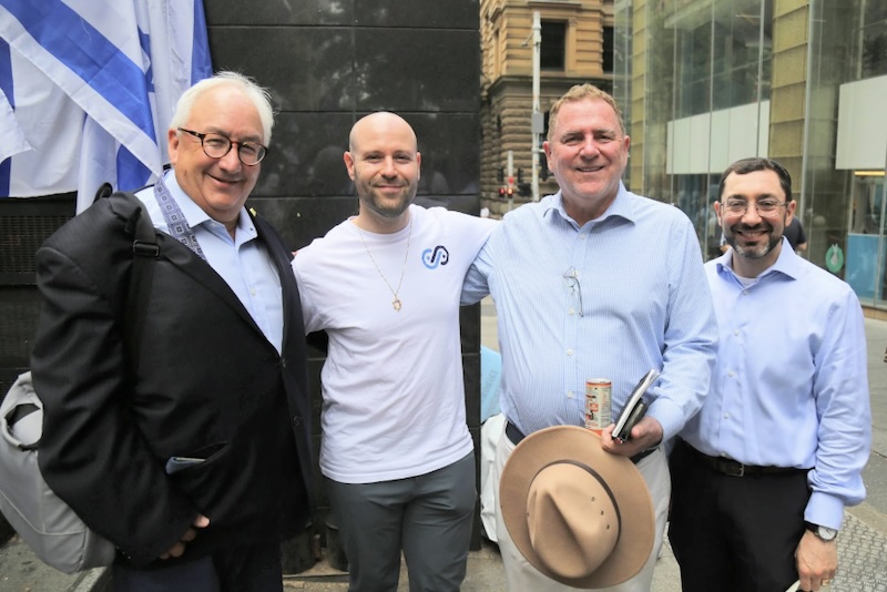 Pictured: L-R Michael Danby(ex-Labor MP and Labor Friends of Israel), Ofir Birenbaum (Together with Israel, friend of Australian Jewish Association), Michael Easson (former VP of Labor Party NSW), Rabbi Benjamin Elton(Senior Rabbi Great Synagogue Sydney at a December 2024 rally. Source: ‘Together With Israel’ Facebook