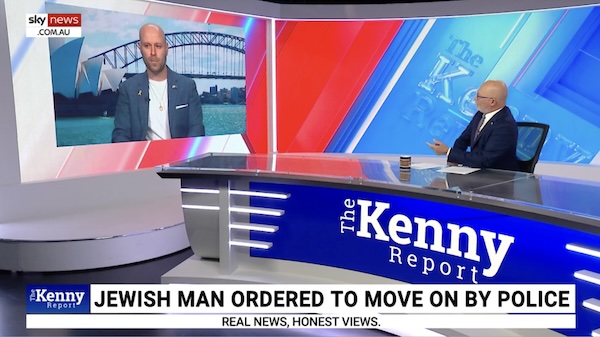 The media circus followed. The Australian Jewish Association tweeted about their “friend”, a “Jew [was] detained outside Sydney’s Great Synagogue for having an Israeli flag.” This incident was then featured in a Sky News story in which right-wing presenter Chris Kenny interviewed Birenbaum.