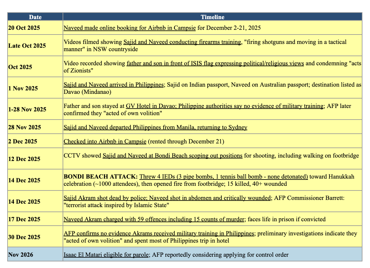 Naveed’s likely radicalisation stretched back years as a teenager, when he first came to ASIO attention in 2019, during the government of former Prime Minister Scott Morrison. The investigation specifically concerned his associations with Sydney-based ISIS cell members, including Isaac El Matari. During this six-month investigation, one of the Bondi killers Sajid Akram was also interviewed by authorities.